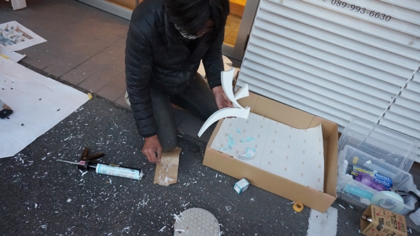 看板工事が始まりました。既存の看板の上に重ねる形で、取り付けていきます。